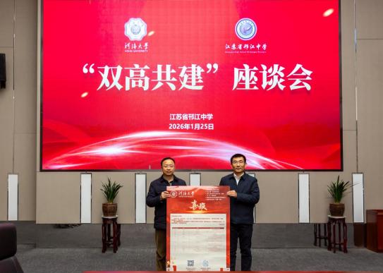 “双高共建”座谈会上,双方围绕优质生源输送、育人资源共享、协同模式创新等深入交流。宋翔洲副校长介绍了河海大学的办学特色、学科优势及人才培养成果。他代表学校向江苏省邗江中学赠送喜报、捐赠“蛟龙号”合金模型,彰显两校在科学精神与文化传承上的深度共鸣。陈军副校长详细介绍了江苏省邗江中学的办学规模及特色、人才培养成果及高三学子升学概况,深切表达了与河海大学深化合作、共促学生成长的殷切期望。