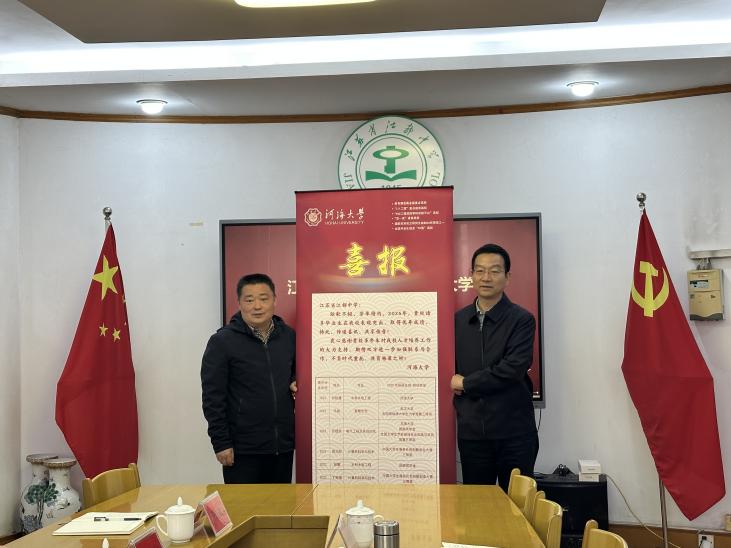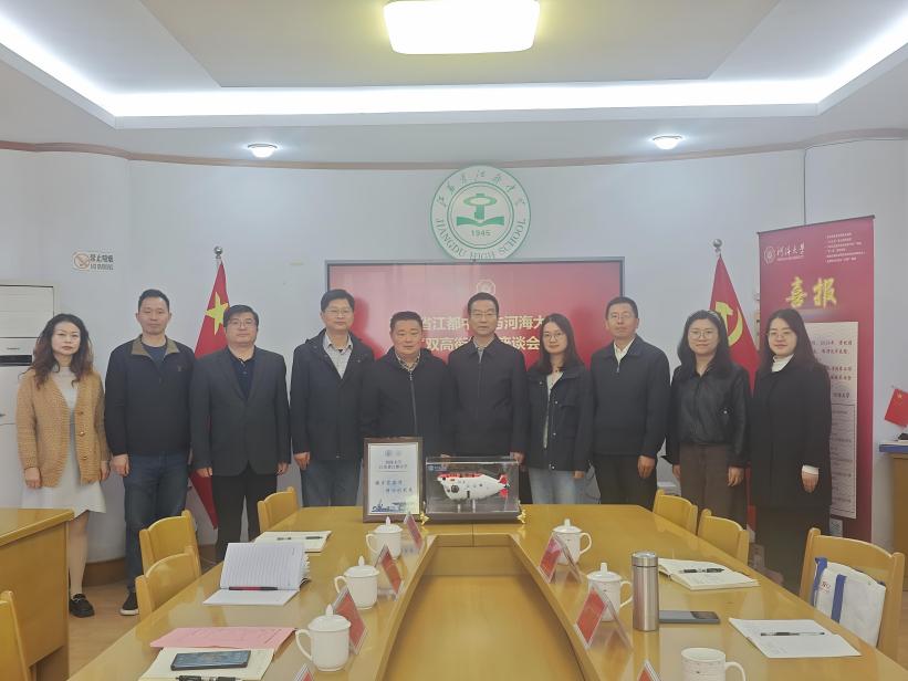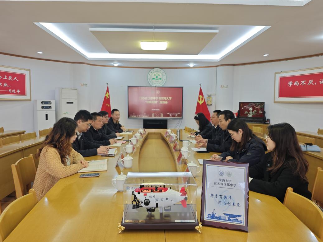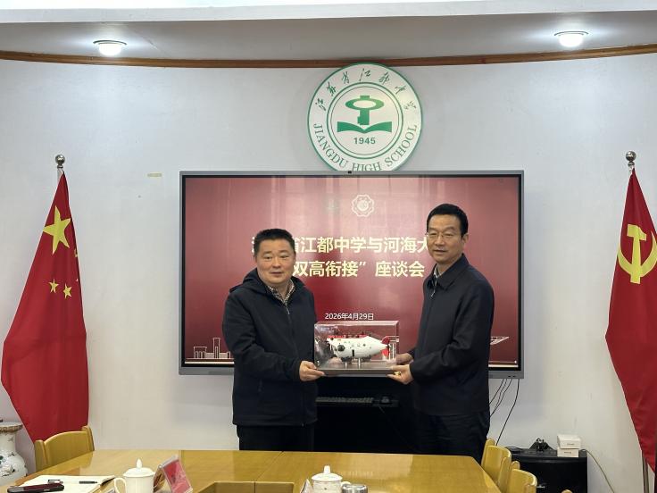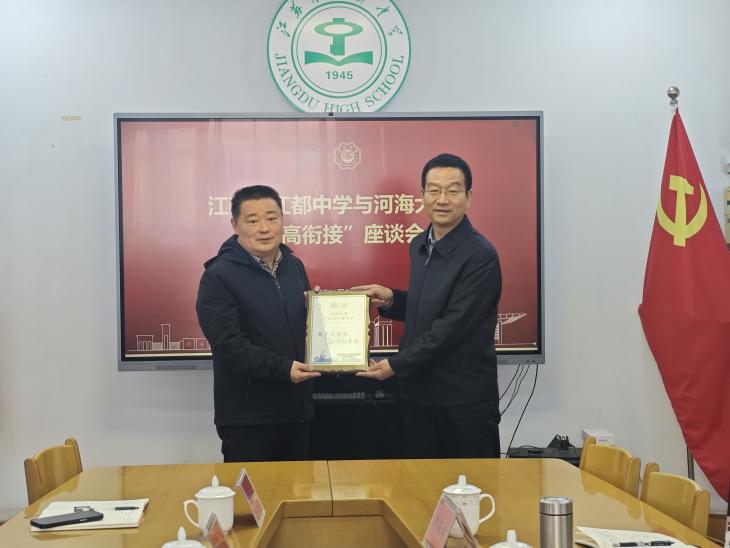 河海大学向江苏省江都中学依次赠送喜报、“双高协同育人牌”,并捐赠“蛟龙号”合金模型,夯实合作基础,接续育人力量。